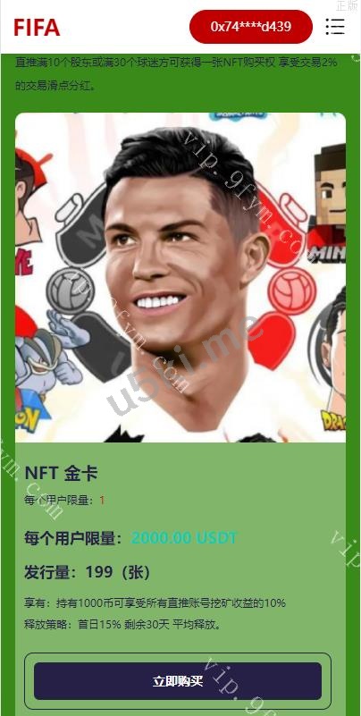 世界杯双语区块链理财/足球球星NFT购买/nft藏品投资 一款以世界杯球星开发的nft藏品购买系统,系统是dapp源码可直接链接钱包购买 源码全开源前端可换任意藏品,前端uinapp开发,后端是fa stadmin框架,接口是nodejs,已失效 编号:1268 付费精品源码