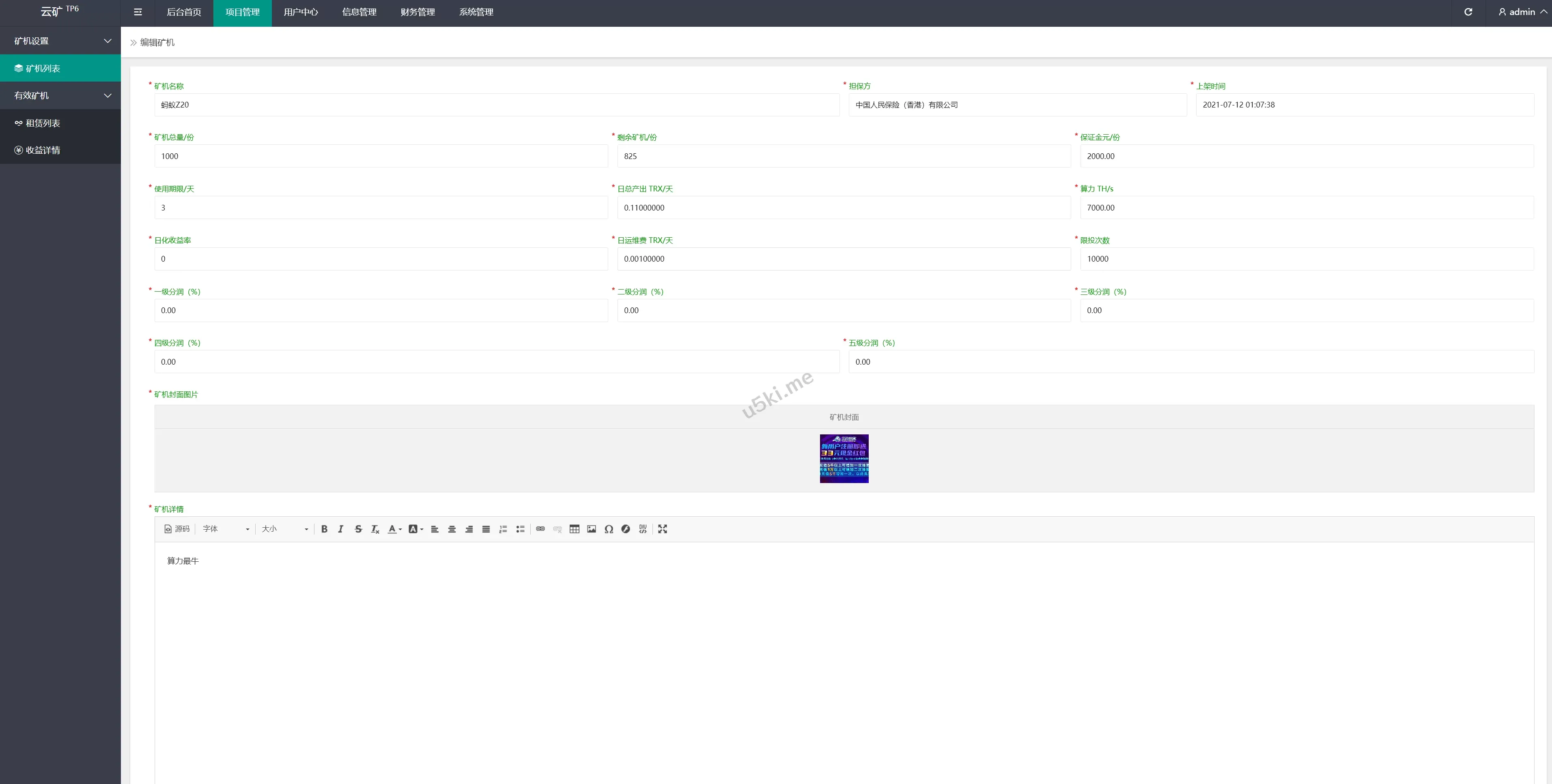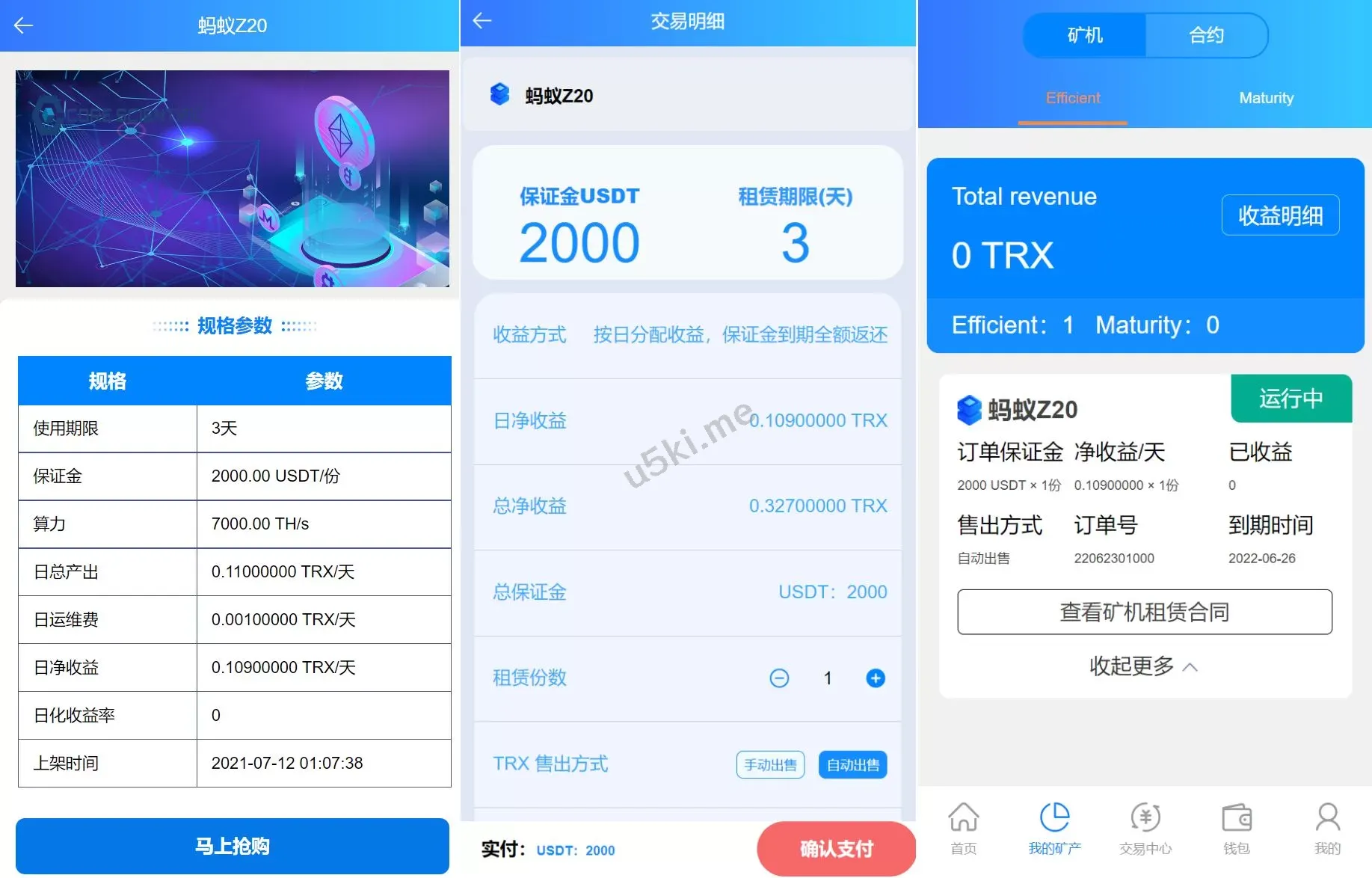 充币依然使用usdt充值,使用usdt购买矿机获取TRX收益