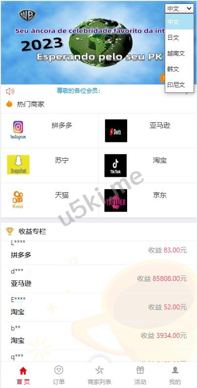 多语言/海外伪商城刷单系统/巴西快三刷单/代理后台/带预设/uniapp/thinkphp长城源码|源码搭建|精品源码|海外刷单|交易所|区块链|理财产品长城源码站系统源码 该系统前端为单语言葡萄牙语的伪商城刷单系统,包含代理后台和预设功能。当前采集功能运行正常,采用Node.js方式进行数据采集。源码中附赠了一个多语言版本(见第一个图),但目前多语言功能尚未完善,订单页仍显示中文。 刷单抢单源码