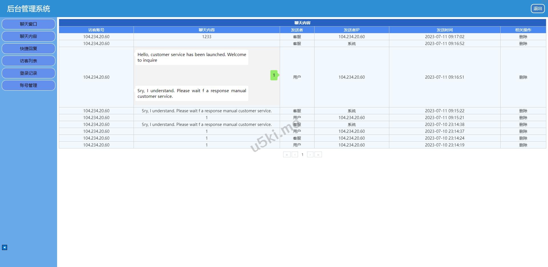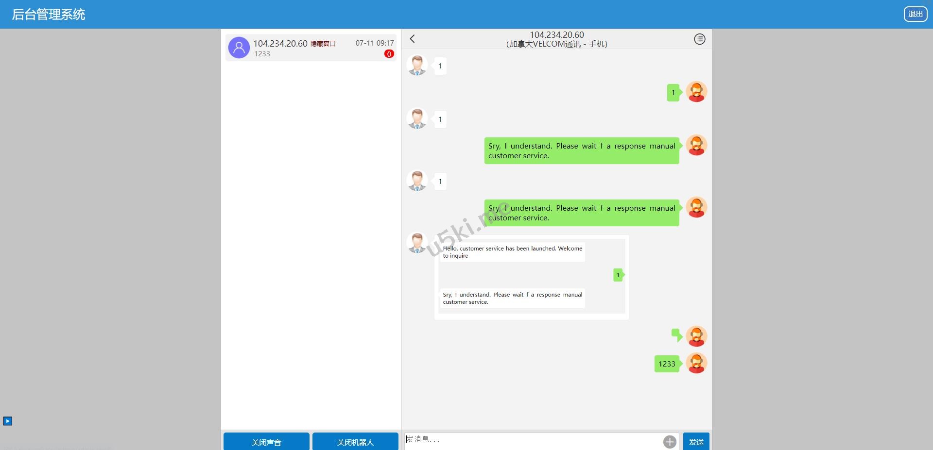 6,后台可设置是否关闭机器人,如关闭,正常会话模式,如打开,自动回复模式,自动回复内容要自己在代码中增加或修改